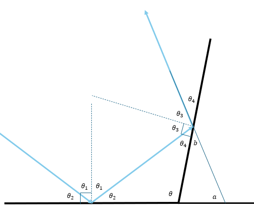 2차 반사된 빛에서 연장선을 그어 바닥의 거울면과 이루는 각을 a, 기울어진 거울면과 이루는 각을 b라고 하자.