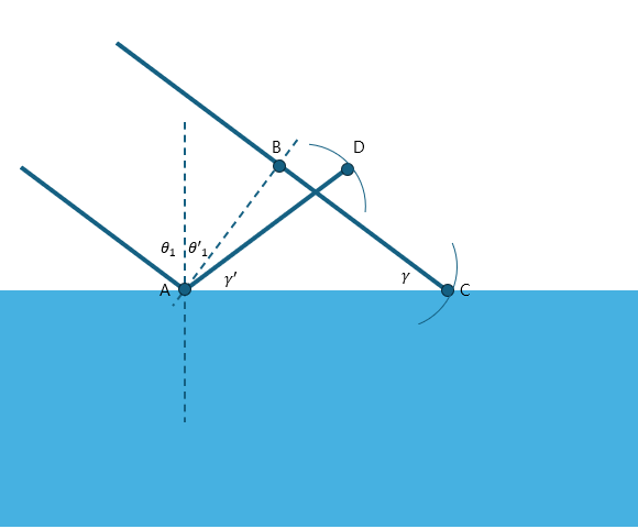 아래의 광선 1이 지점 A에서 반사되었을 때, 입사광선이 법선과 이루는 각을 θ1, 반사광선이 법선과 이루는 각을 θ'1이라고 하고, 반사광선이 바닥과 이루는 각을 γ', 광선1과 평행한 광선 2가 바닥과 이루는 각을 γ라고 하자.